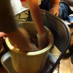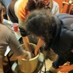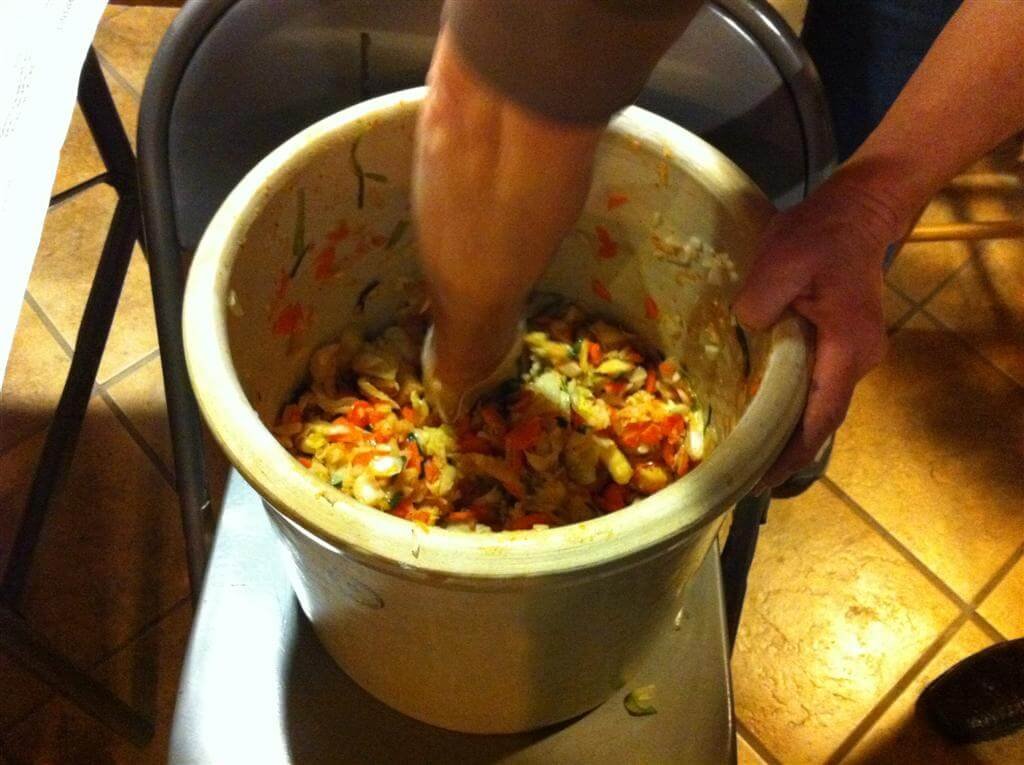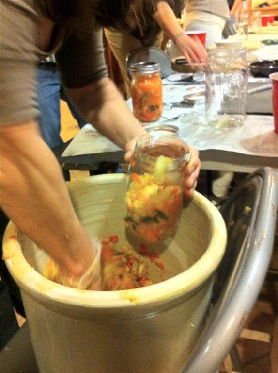 Everyone got to pitch in chopping the other veggies. Then we drained the cabbage and threw it all into a 5-gallon crock. At that point we added the spice mix and invited everyone to help massage the spices into the mix. Then everyone filled a quart-sized mason jar roughly half-full, and we gave them instructions on how to care for it once they got home (weigh contents down so they stay moist under the brine for a week, then transfer to fridge).