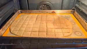 - After 15 minutes, the batter will firm up. Remove pans and score the batter into bite sized (1 inch or 2.5 cm) squares with a pizza cutter or dough scraper. Rotate pans and switch trays to other racks to ensure even cooking.