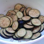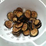 - Drain the slices through a colander, reserving about a cup of the brine. Lightly squeeze the slices to ring out excess brine (eggplants are like sponges).
