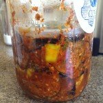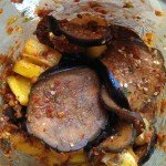 - Wearing a latex or plastic glove to protect yourself from the heat of the peppers, Mix paste thoroughly with your hands into the eggplant, peppers, and the other half of the scallions. You can mix everything directly in the fermenting container, or in a separate large mixing bowl. Mix until the veggies are coated nicely with the paste.
