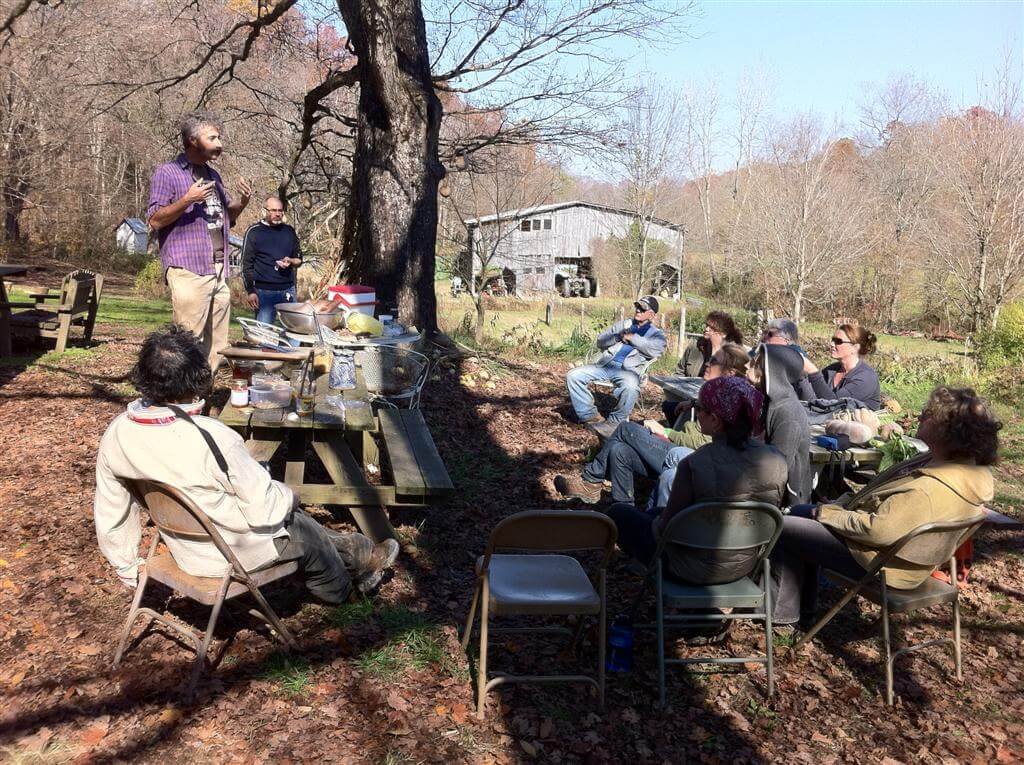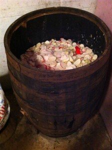 One of our field trips during the workshop took us to Long Hungry Creek Farm, a biodynamic farm run by the Barefoot Farmer, Jeff Poppen. There we picked cabbage, turnips, and radishes, in order to make a large quantity of sauerkraut. Jeff plants radishes as a cover crop, and we were allowed to take as much as we want (we got about 600 lbs total!) Afterwards, Sandor held a mini-workshop on fermenting vegetables at the farm, and we spent the afternoon at the farmhouse. Throughout the day, folks from all over the area came in and out. It was an inspiring sense of community and I was grateful to be invited. One bit of unwelcome news for the farm: a large poultry producer is building a factory-coop upstream and not very far from the farm. I wish LHC Farm well in their efforts to protect their land from the effects of being downstream and downwind from a factory farm. It’s an unenviable position to be sure.