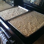 - After granola has dried to the desired crunchy/chewy texture (from 8 to 24 hours), remove from oven.