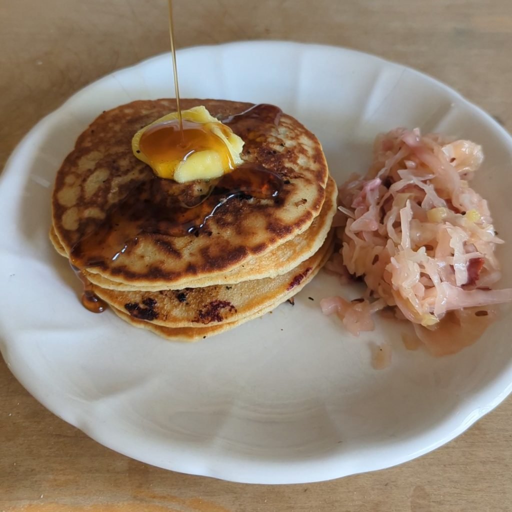 Served with a side of strawberry sauerkraut, some grass-fed butter and maple syrup!