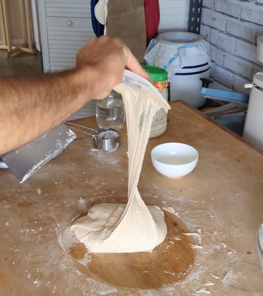 After pouring it onto the bench, I added a bit of flour, but realized that it just was never going to shape properly.