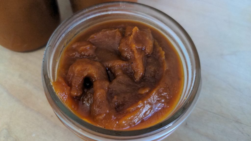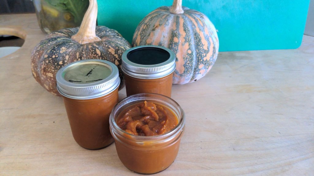 Note, as most other recipes for pumpkin butter will also warn you, that this recipe is not acidic enough to be safely stored after water bath canning. The batch of pumpkin butter I made had a pH of 4.9, just slightly outside the safe zone (4.6 pH) for water bath canning. An alternative preservation method for low acid foods such as squash is pressure canning. Personally I haven’t done much with that method. If you have, please leave a comment!