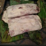 - If using banana leaves, add a square or rectangular portion of the mixture about 1 inch thick (not thicker than 1 1/4") to the center of the leaf. Fold the sides in (like you are wrapping a gift). Fold the ends in and use toothpicks to secure the ends of the "package".