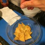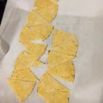 - Stack the tortillas 4 or 5 high. Slice the stack in half and repeat until you have made 4 cuts (8 chips from each tortilla). Repeat until all tortillas have been cut.